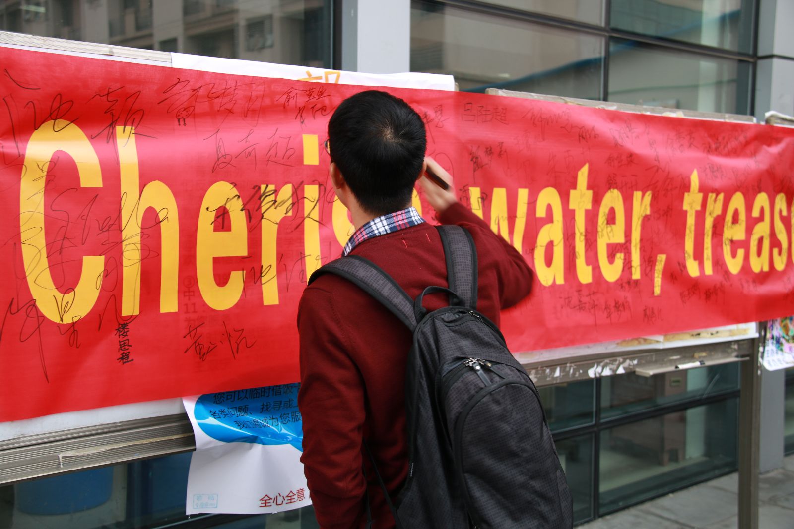 在和畅餐厅门口举办了横幅签名活动。横幅上的“Cherish water, treasure life”标语不断吸引着大家的眼球,同学们纷纷驻足在横幅前,并在横幅上签下自己的名字。