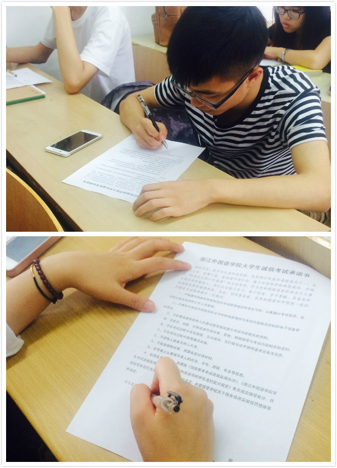 第一次招收的一本专业学生。率先在该班试点“诚信考场”旨在深化诚信观念,检阅学生的自律能力和诚信品德。“诚信考场”动员大会上,14英语师范1班每个学生认真签署了诚信考试承诺书。