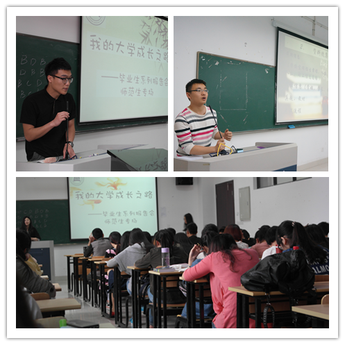 近日举办了“我的大学成长之路”毕业生系列报告会,通过大四同学现身说法的朋辈互助形式,分享成才就业成功经验,为低年级同学指点迷津、明确方向、提供借鉴。