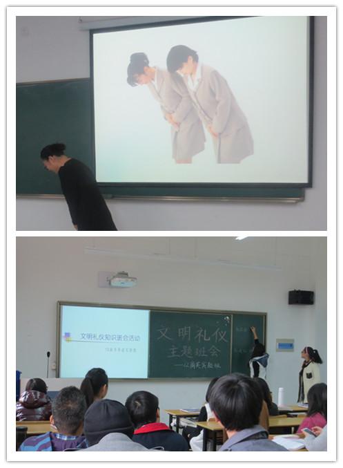 此外,英文学院以班级为单位,召开了形式多样的主题班会。同时,学院积极开展宣传,在教室、图书馆、寝室门厅、食堂等地粘贴文明礼仪、勤学修身方面的宣传标语,悬挂横幅,营造良好的舆论环境。