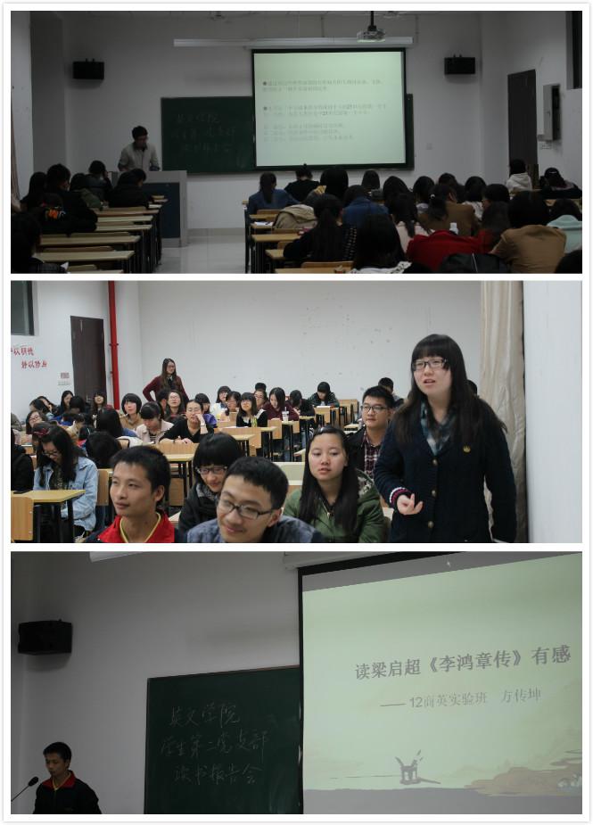 读书报告会上,学生党员分享了《李鸿章传》(梁启超著)、《丰乳肥臀》(莫言著)等书籍的读后感,从不同角度发表了自己的体会——有的用辩证唯物观点对李鸿章这一历史人物作出评价,借此引申大至祖国统一小及为人处事等话题,观点鲜明而深刻;有的从“作者介绍——人物关系解读——读后感想”谈了自己启发与感想;还有的在阅读中提炼出“平等、生命、强大”三个主题,发人深思,充满启示。