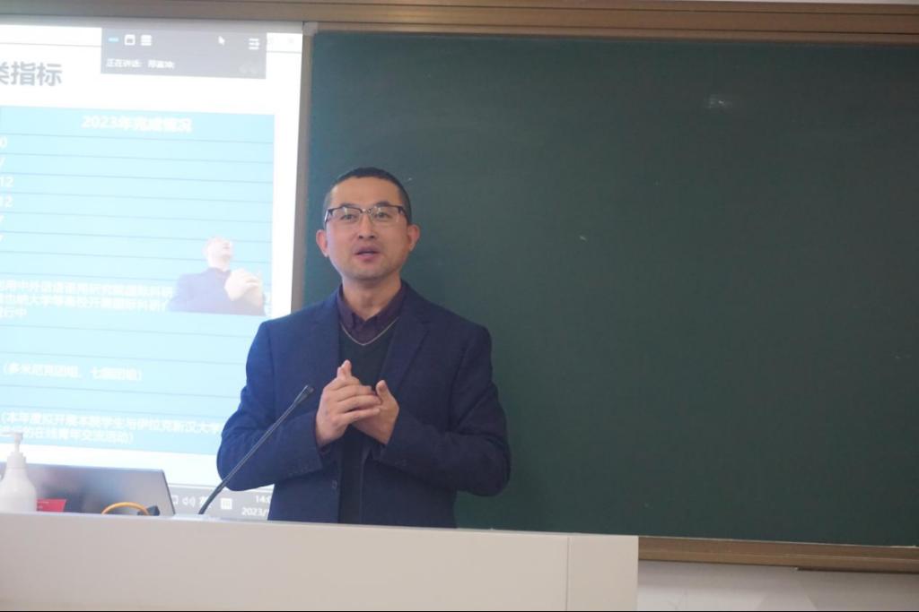 学科建设的现状,剖析了当前英语类专业发展面临的内外部挑战和困境。在此基础上,他提出了学院学科的总体布局、学科建设的总体思路、学科架构初步规划、学科团队建设目标和任务等,并就未来优化学科布局、组建学科团队和建设特色领域等方面的工作进行了具体谋划。随后,他详细阐述了专业与学科的关系,提出了学院专业建设的总体目标、专业改造和创新的规划,具体分析了现有专业的培养特色、实践场景、任职行业、核心课程等,以及下一步的具体实施计划。