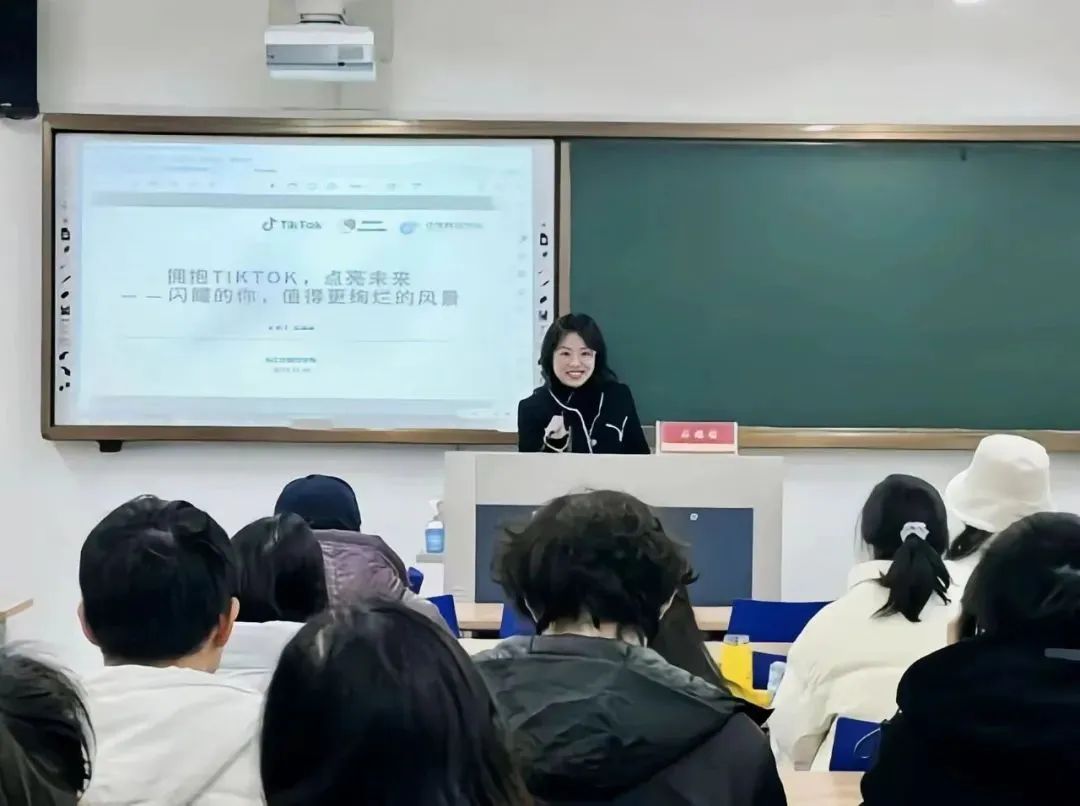 高端端分享了自己的海外留学、上市公司供职、自主创业等经历。从同学们平时自媒体软件的使用情况入手,向同学们提出如何将自己的校园生活与世界接轨的问题,并借此向同学们介绍TikTok和佳美传媒,帮助大家了解当下社交媒体的发展形势。