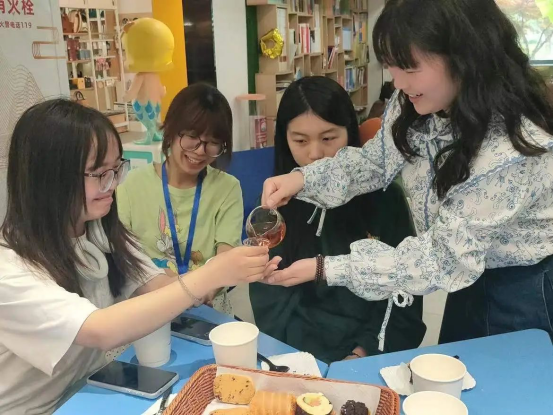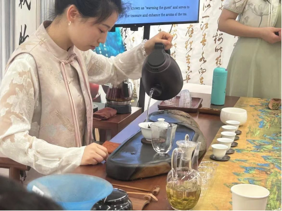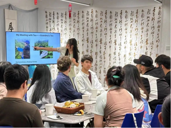 4月25日下午,英文学院“理解当代中国,知行活力浙江”跨文化交际时光活动第七期如期开展。来自21英师4班的张星琪以中国茶文化为主题,带我们了解了中国茶文化的历史以及各类茶叶的特色,感受中国深厚的茶文化氛围和历史底蕴。活动现场,来自墨西哥,法国,摩洛哥等国家的留学生们与英文学院的师生在小石光开启了一段悠然的品茗时光。
