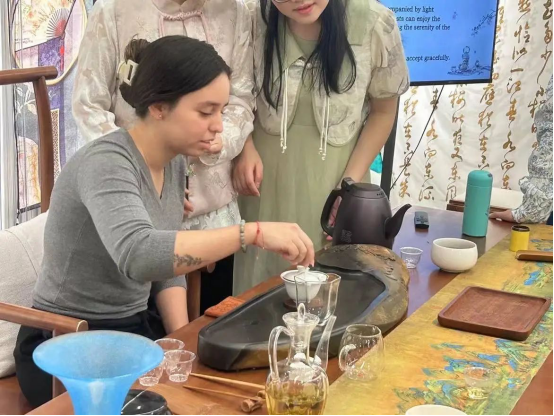 随后张星琪引导大家进入了品茶泡茶环节。本次活动邀请了一名神秘嘉宾——秦国华老师为大家现场演示泡茶的流程:温杯—投茶—洗茶—泡茶—出汤—分茶。一举一动,尽显东方神韵,同学们摈除喧闹,认真观摩着老师的一举一动。泡茶结束后,主持人和主讲人针对茶品介绍和泡茶环节进行小提问,以热茶为礼,热闹现场。不管是留学生还是中国学生,纷纷举手,分享“切磋”刚刚所学的茶文化。