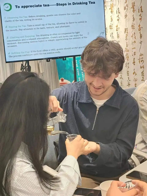 第四次参加英院“跨文化交际时光”活动啦!今天的主题是中国茶文化,说实话我对茶不怎么了解,平时也不喝,只知道龙井、普洱、铁观音一些茶名,但分辨不出来。主讲人张星琪学姐的讲解通俗易懂,丰富了我对茶文化的认识,最后茶艺师冲泡了乌龙茶、鸭屎香等几种茶叶,留学生都是一口气喝完了,有的觉得很苦,有的说没有闻出香味,我们告诉他们最好小口小口地喝,细细地品尝。顺便说一下,今天的留学生比以往都多,我这桌有三个乌兹别克斯坦人,还有一个中文超好的越南人,聊得非常开心,笑声不断,感谢英院的组织,我更加期待之后的主题了!