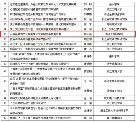 近日,2024年浙江省社科规划“社科赋能行动”专项课题拟预立项名单现已公示, 国产av 共有10项项目顺利入围,其中英文学院何习尧老师以“以特色县域文化赋能缙云文旅融合高质量发展”专项课题获得立项。