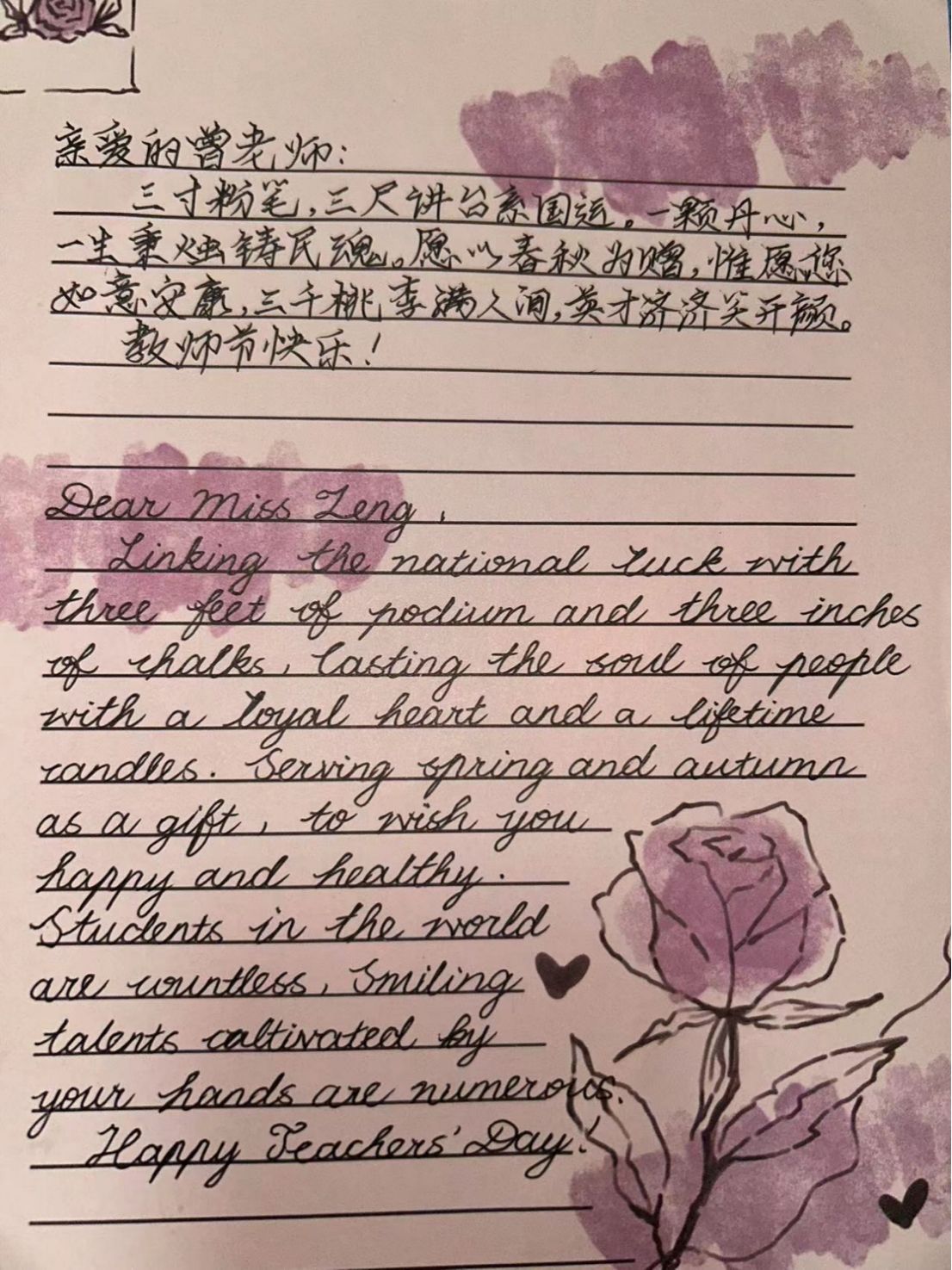 在这个特别的日子里,我怀着无比真挚的心情,向所有老师致以最深的敬意。尤其要特别感谢我的综英课老师——盛老师:在课堂上,是您用温柔的话语鼓励我们勇敢地表达自我,每次不自信的回答却会得到您由衷的表扬。是您细致入微、认真负责地指导我们进行专四的学习,与同学们共同努力之下,我们实现了从模拟测试垫底到百分百通过率的飞跃!盛老师,教师节快乐!愿您幸福安康,岁月悠悠如诗,美好时光常伴左右!