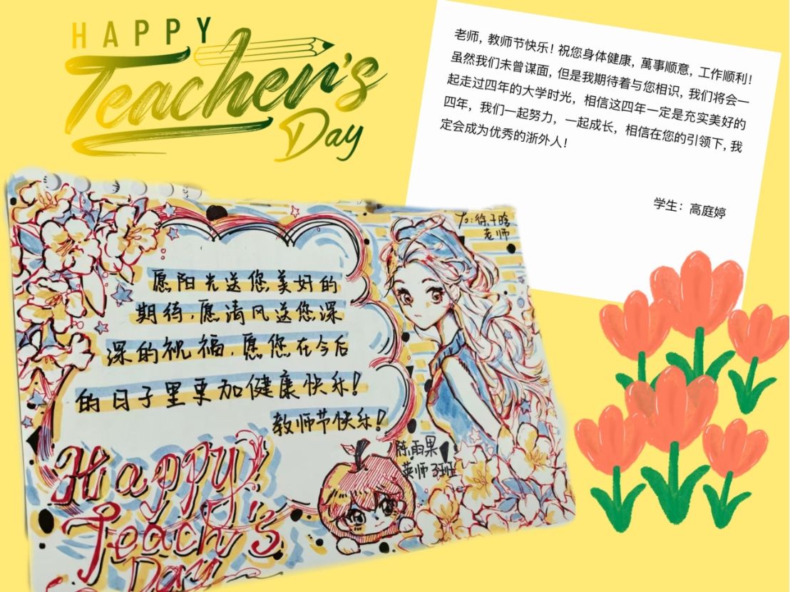 亲爱的丁老师,感谢您在英语演讲课上的鼓励,让我们越来越不怯场,能以更从容自信的姿态投入到每一次课程中,让我们有更好的状态学习并掌握专业知识。师泽如山,微以致远,师恩似海,润泽心田。愿您的教育生涯如诗如画,岁月静好,桃李芬芳。祝您节日快乐,身体健康,诸事顺利!