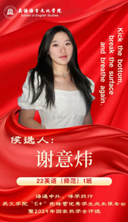 为扎实推进学院国家奖学金评选工作,发挥青年榜样的示范引领作用,充分展示英文学子成长事迹和精神风貌,学院将组织开展英文学院“E+”先锋营优秀学生成长报告会暨2024年国家奖学金评选。