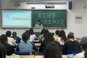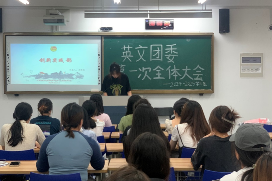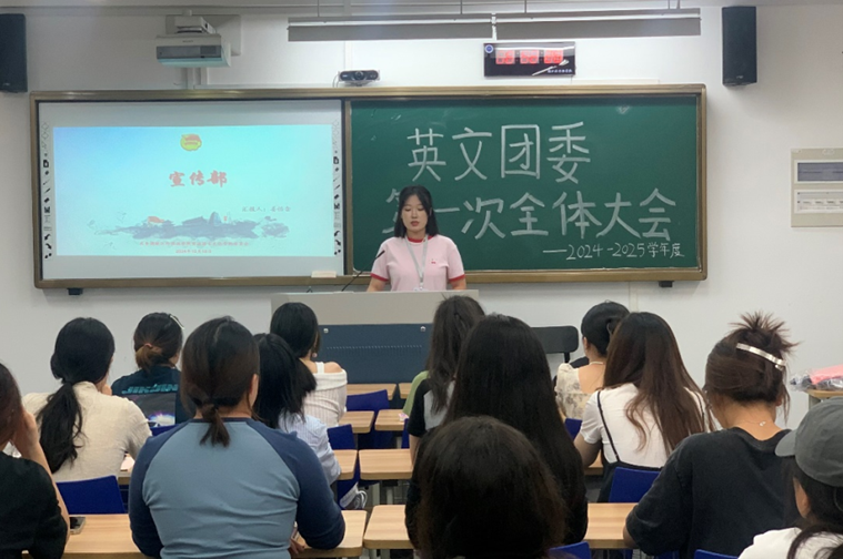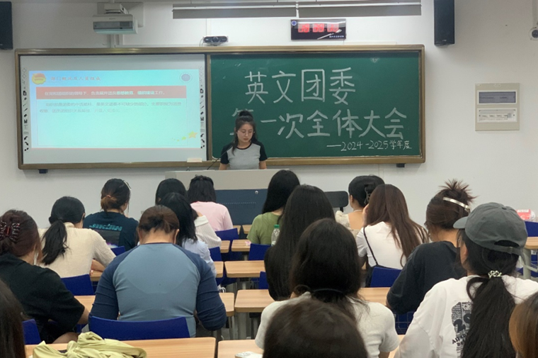 为贯彻落实习近平新时代中国特色社会主义思想和党的二十届三中全会精神,进一步推进英文学院团委工作开展,10月18日,2024-2025学年英文学院团委第一次全体大会在融A105顺利召开,团委副书记(学生)陈欣夷主持会议。