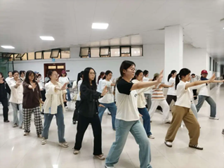 当阴阳调和,太极拳方阵是流动的水墨画卷。感受着内心的宁静,他们身形下沉,仿佛山间松柏深根大地;他们双手舒展,如同晨曦柔风轻掠湖面。一招一式,刚柔并济,蓄蕴着英院学子扶摇直上之豪壮;一起一落,天地相和,凝聚着英文学院舒天昭辉之大气!