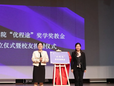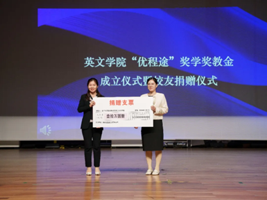 会上,进行了英文学院“优程途”奖学奖教金成立仪式暨校友捐赠仪式,田俊杰和学院2007届校友、杭州优程途留学有限公司总经理、创始人董淑娥共同为“优程途”奖学奖教金揭牌并交接捐赠支票,田俊杰向董淑娥颁发捐赠证书,并代表学院聘任其为留学导师。