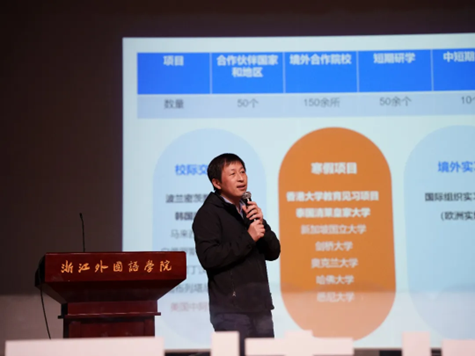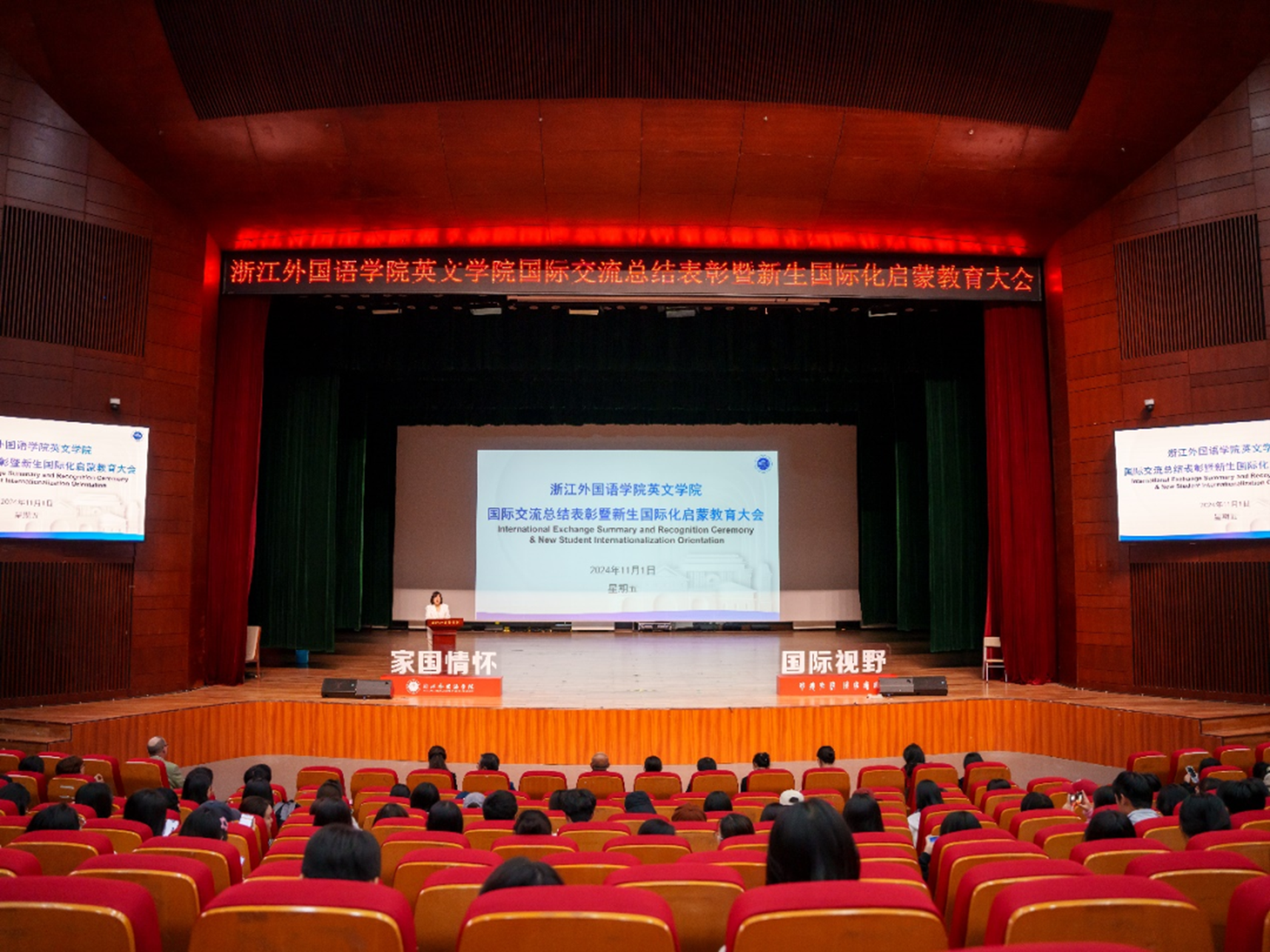 11月1日下午,英文学院国际交流总结表彰暨新生国际化启蒙教育大会于追梦堂隆重举行。副校长柴改英,浙江文化“走出去”协同创新中心主任赵伐,国际交流与合作处副处长严伟剑,英文学院党委书记田俊杰,副院长郑淑贞,英文学院特聘教授张贵洪,翻译系教师李乐,英语系教师白天依、张静静,外籍专家James O’Donnell,相关企业代表,学院办公室、学工办教师代表以及全院各年级学生参加。大会由院长助理周静副教授主持。