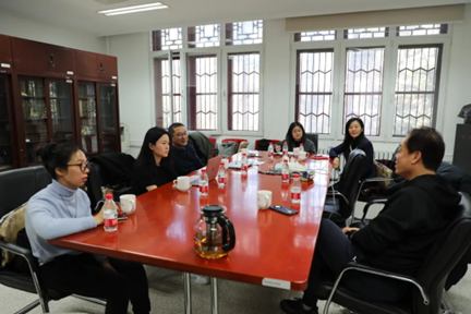 邢富坤、盛煜冰、张春青、陆海霞、郭安琪、张静静与北大外语学院副院长付志明进行了座谈。双方就教学相关的议题展开了讨论。付志明介绍了北大外语学院教师师资队伍、学生人才培育现状与困境、课程设置、跨学科与兴趣班项目开展等情况做了详细介绍。双方就未来合作的可能性展开了深度洽谈,双方都表示将为 国产av