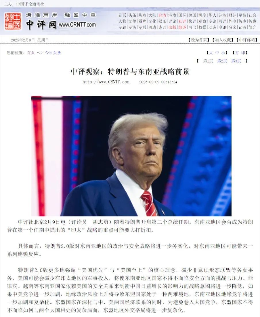 近日,中国评论新闻社头版刊发了英文学院特聘教授胡志勇的文章。文章中,胡志勇就特朗普与东南亚的战略前景等问题发表评论。