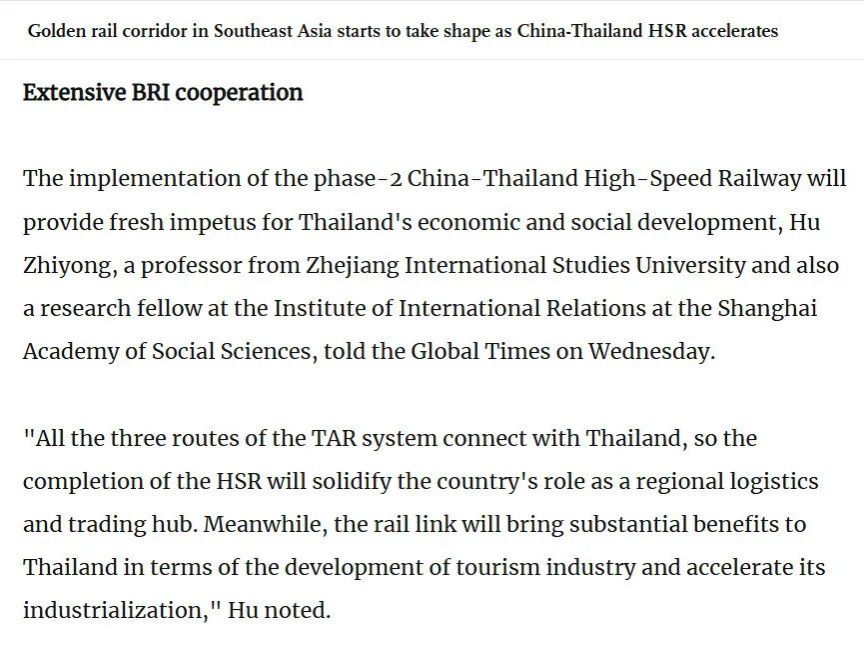 近日,英文学院特聘教授胡志勇接受《环球时报》的记者采访,针对中泰铁路二期建设发表评论。胡教授提到,泰国战略位置决定中国泛亚铁路网要联接泰国,泰国是联接中南半岛部分国家与东盟其他国家的桥梁,中泰铁路二期是推动泰国经济新一轮发展的驱动力。