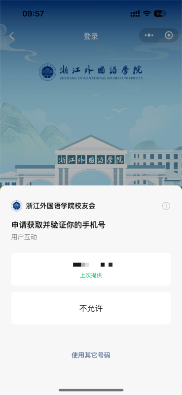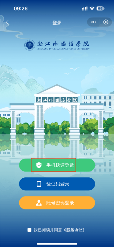 “校友卡申领”进入登录界面,勾选下方《服务协议》并点击“手机快捷登录”即可自动注册用户。