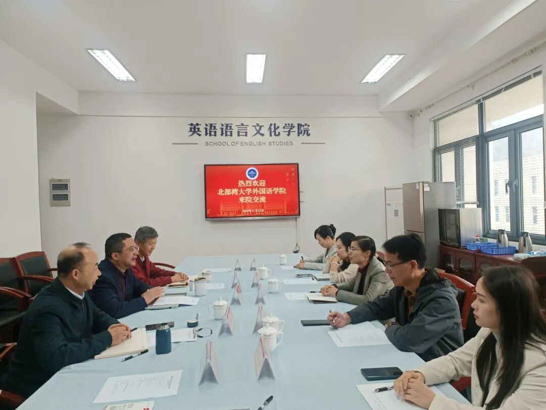 近日,北部湾大学外国语学院副院长黎茂昌一行来英文学院调研交流。英文学院院长邢富坤,副院长郑淑贞,学术副院长赵歆,外语教育系学科专业负责人、外语教育研究中心主任常俊跃教授,区域国别与商务英语系胡志勇教授参加座谈。