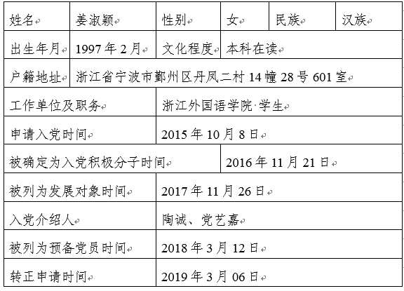 在听取党小组和党员、群众意见的基础上,经支部委员会审查,拟将姜淑颖同志转为中共正式党员。根据发展党员工作的有关要求,现将她的有关情况予以公示。