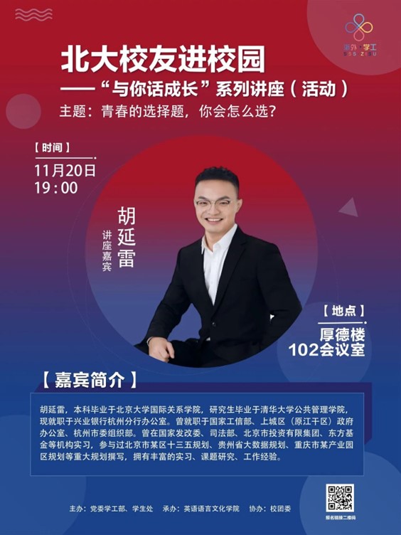 “外语名校”建设的新篇章。“在浙外遇见北大”,为进一步发挥榜样引领作用,助力同学们在和山下筑梦逐梦圆梦,不断提升核心素养,学工部特推出“北大校友进校园——与你话成长”系列讲座(活动)。