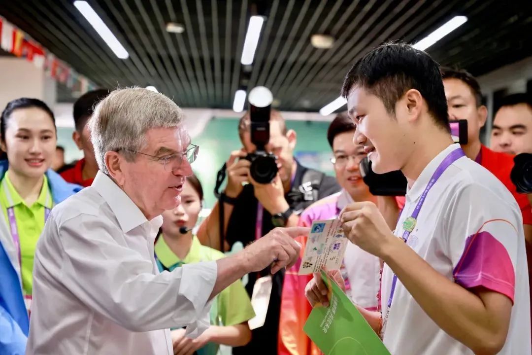 杭州亚运会期间,时任国际奥委会主席巴赫与学院师生志愿者亲切交谈