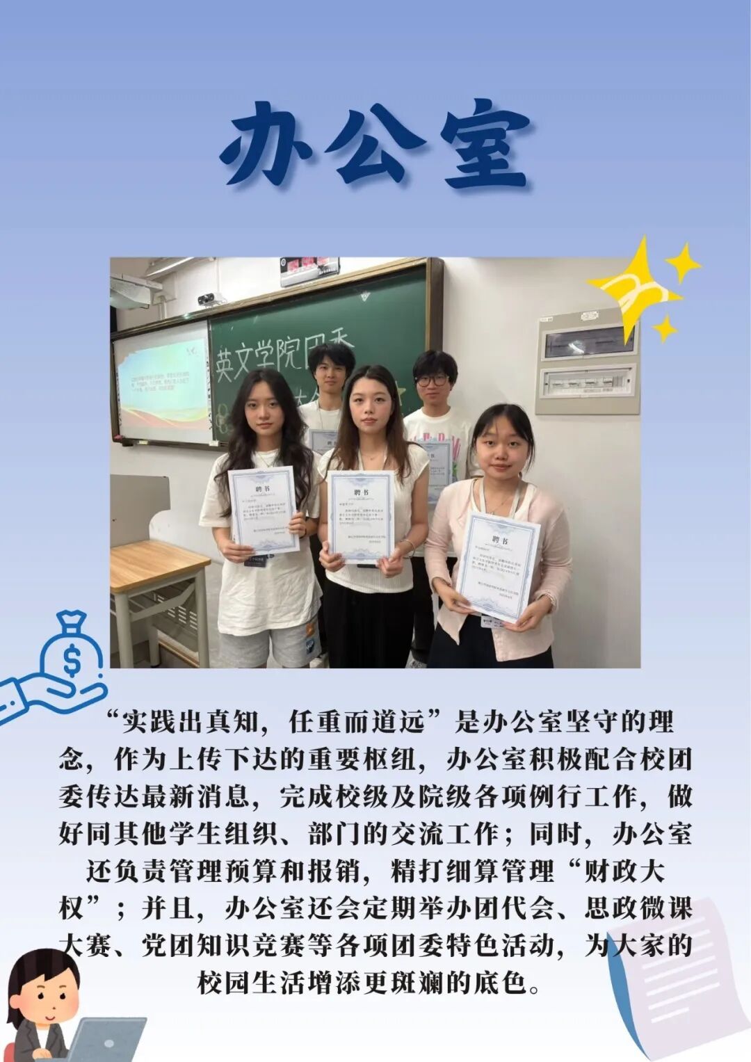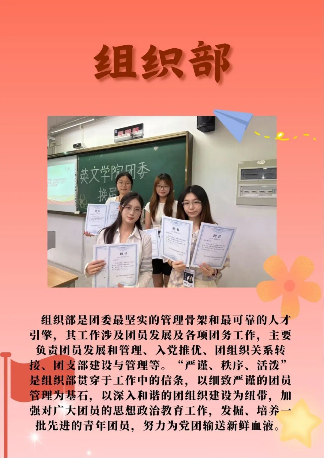 英文学院团委内设办公室、组织部、宣传部、创新创业部、实践部、志工部六大部门。每个部门各司其职又相互配合,是学院开展团学工作的得力助手。