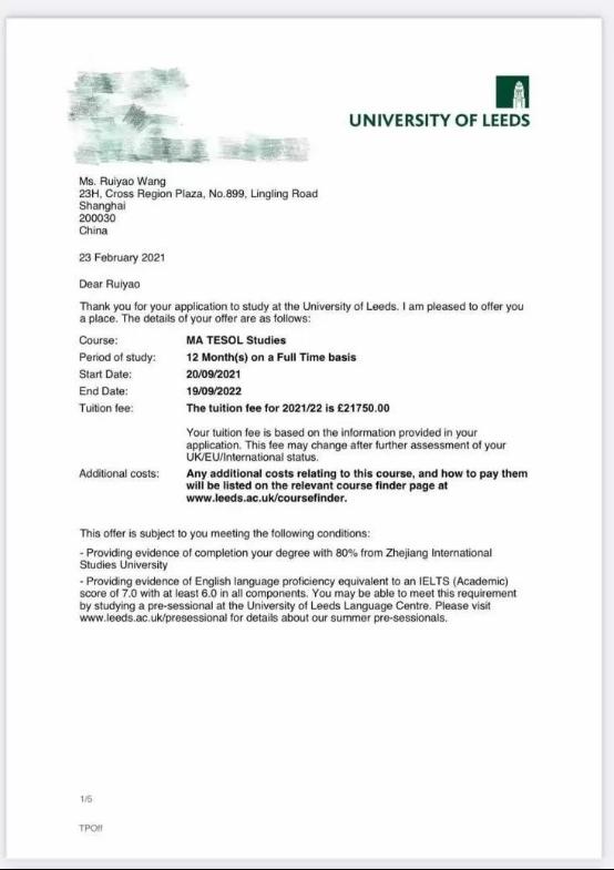 利兹大学录取通知书