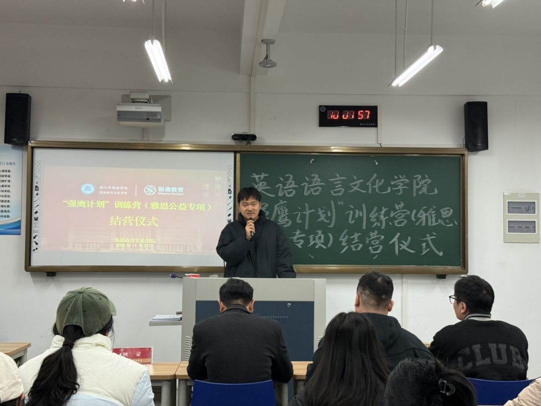 11月27日晚,英文学院“强鹰计划”训练营(雅思公益专项)结营仪式在融B104举行。新通教育杭州外语高校市场总监黄庭翔、市场代表李洋受邀出席,英文学院党委副书记、纪委书记欧万彬,2026届就业负责人吴小慧及全体训练营成员共同参与,学工办负责人顾蒙主持。